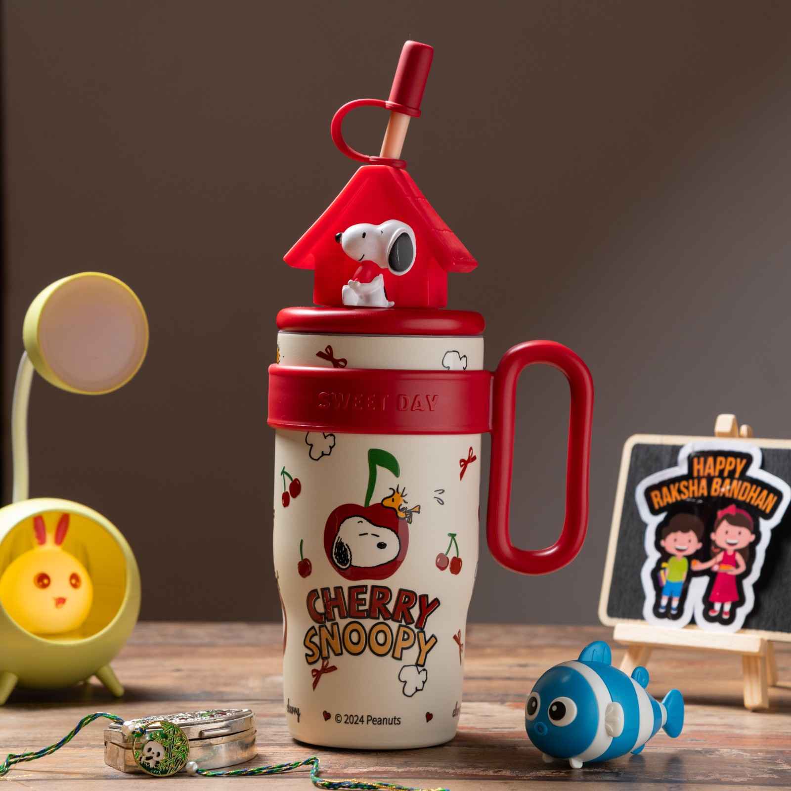This charming 800 ml thermos cup features a playful Snoopy design dressed in an explorer outfit, complete with a 3D Snoopy head on the lid and a sturdy handle for easy grip. With a red and brown color scheme, it offers both insulation and whimsical aesthetics. The double-wall construction ensures beverages stay hot or cold for hours, making it a functional and delightful choice for daily hydration.